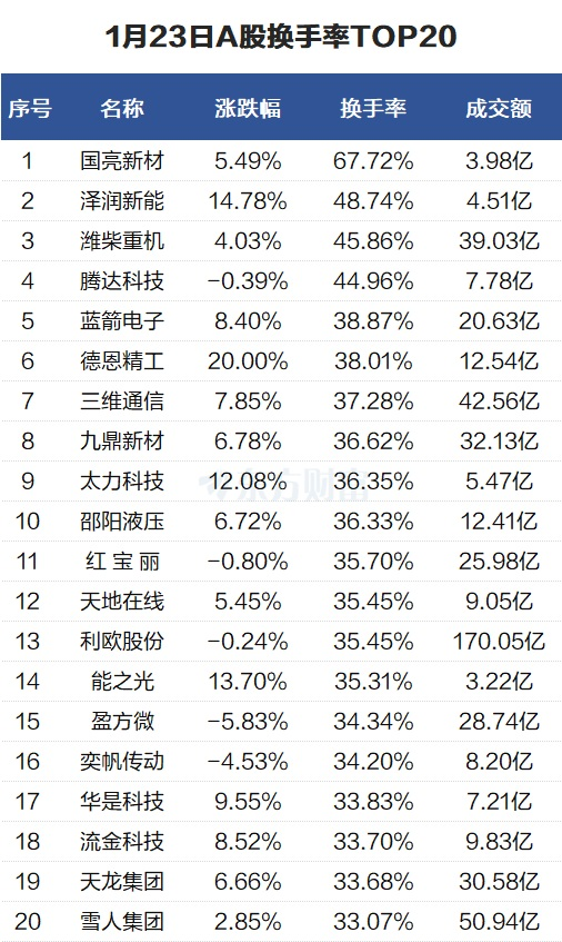当天换手率最高的个股为国亮新材,全天换手率67.72%。泽润新能紧随其后,全天换手率48.74%。