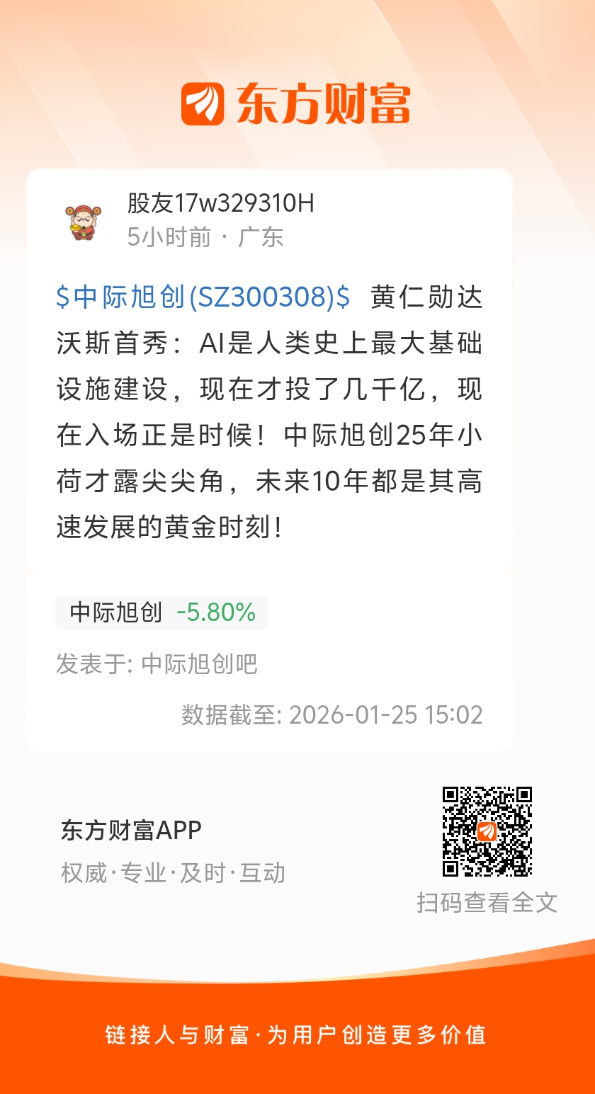 $中际旭创(SZ300308)$ 黄仁勋达沃斯首秀:AI是人类史上最大基础设施建设,现在才投了几千亿,现在入场正是时候!中际旭创25年小荷才露尖尖角,未来10年都是其高速发展的黄金时刻!