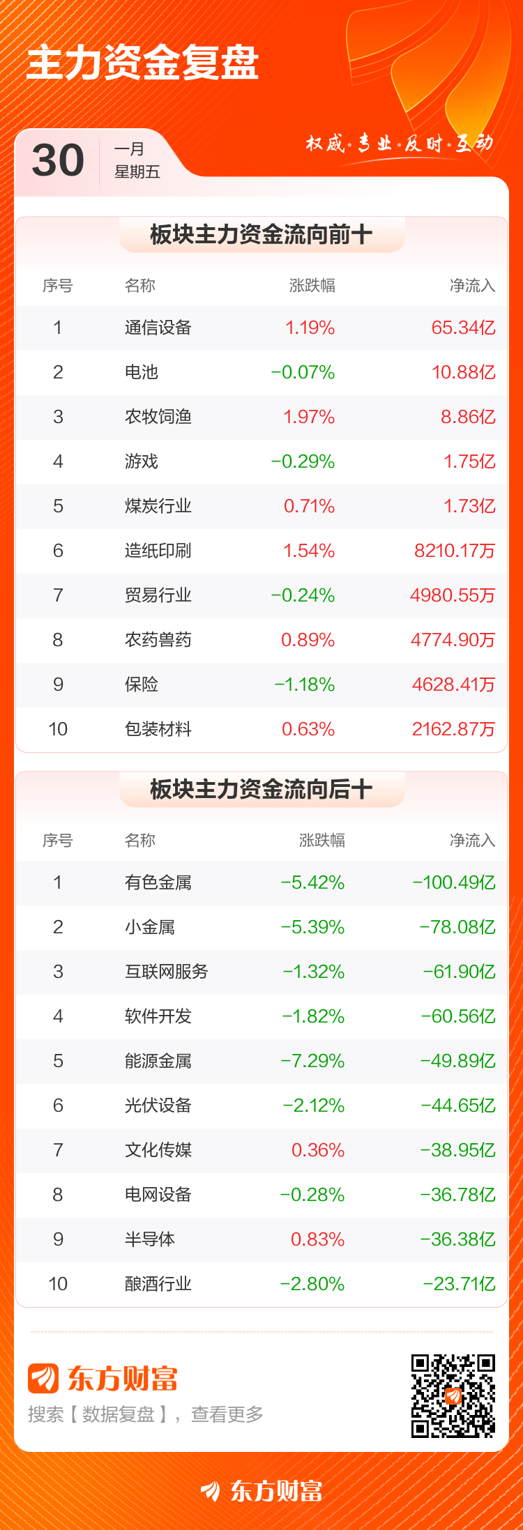 1月30日,沪指跌0.96%,深成指跌0.66%,创业板指涨1.27%。两市成交额2.84万亿,较上个交易日缩量3945亿。数据显示,今日大盘主力资金净流出948.68亿。通信设备、电池、农牧饲渔等板块主力资金流入排名居前,其中通信设备净流入65.34亿元。