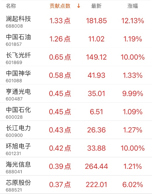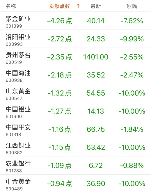 对上证指数贡献点数最多的个股是澜起科技,贡献1.33点,该股当日涨12.13%,收盘价181.85元;拖累点数最多的个股是紫金矿业,拖累4.26点,该股当日跌7.62%,收盘价40.14元。