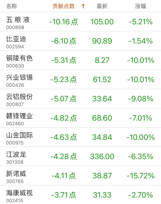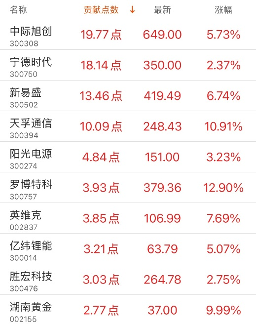 对深证成指贡献点数最多的个股是中际旭创,贡献19.77点,该股当日涨5.73%,收盘价649元;拖累点数最多的个股是五粮液,拖累10.16点,该股当日跌5.21%,收盘价105元。