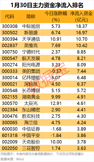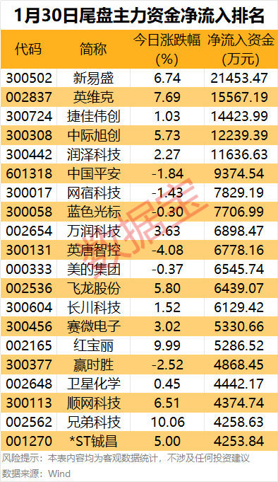 从个股来看,5股尾盘主力资金净流入金额均超1亿元,新易盛尾盘主力资金净流入2.15亿元,居首。还有英维克、捷佳伟创、中际旭创、润泽科技尾盘主力资金净流入居前。