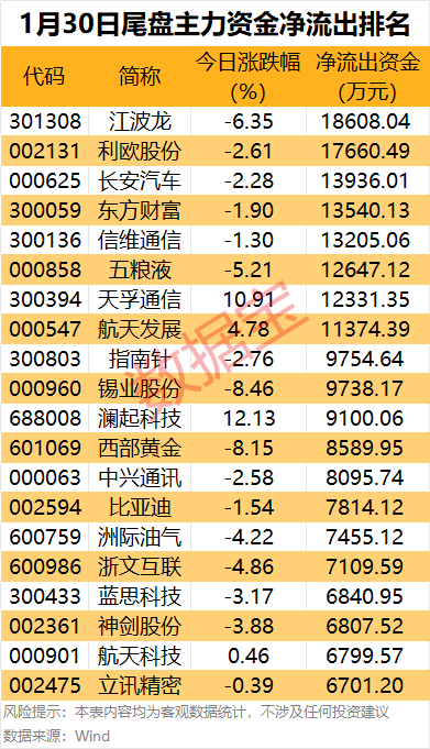 此外,还有利欧股份、长安汽车、东方财富、信维通信和五粮液等热门股尾盘主力资金净流出金额居前。