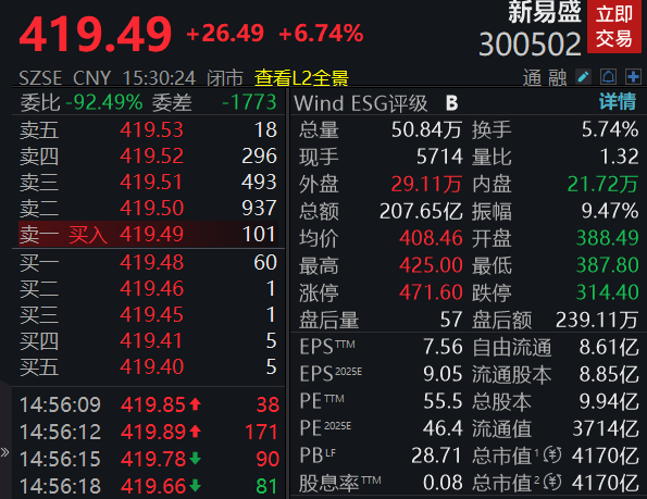 1月30日收盘,新易盛股价大涨6.74%,报419.49元/股,总市值为4170亿元。股价近一年来,已累计上涨近368%。