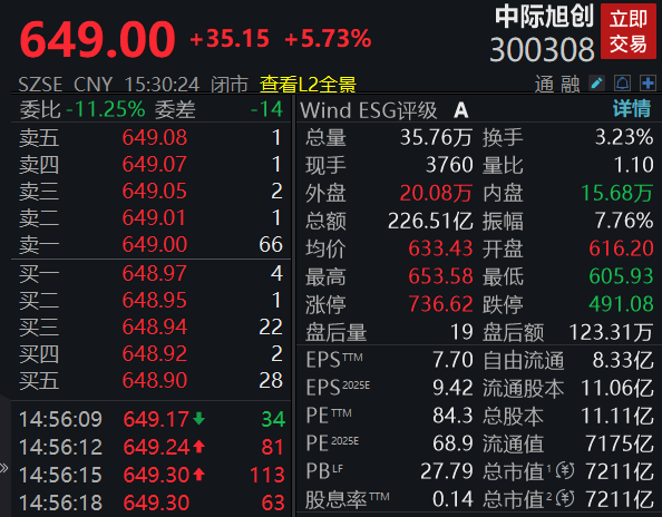 1月30日收盘,中际旭创股价大涨5.73%,报649元/股,总市值为7211亿元,其单日成交额多次位居A股第一。
