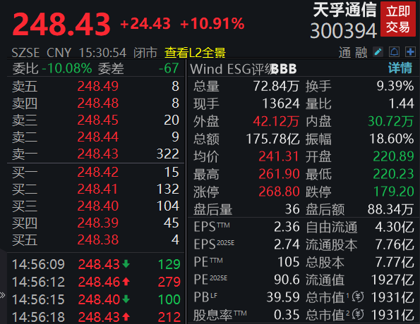 1月30日收盘,天孚通信股价大涨10.91%,报248.43元/股,总市值为1931亿元。股价近一年来已累计上涨近247%。