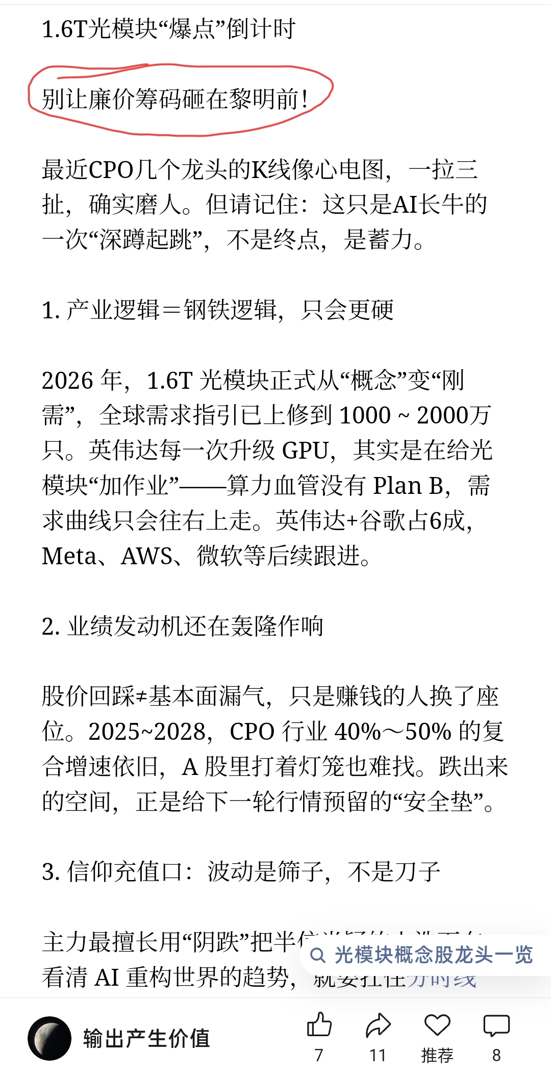 1.6T CPO光模块“爆点”倒计时,耐心比黄金重要!股价回踩≠基本面漏气,只是赚钱的人换了座位。2025~2028,CPO光模块行业 40%~50% 的复合增速依旧,A 股里打着灯笼也难找。跌出来的空间,正是给下一轮行情预留的“安全垫”。学习认知底层逻辑,相信价值投资!