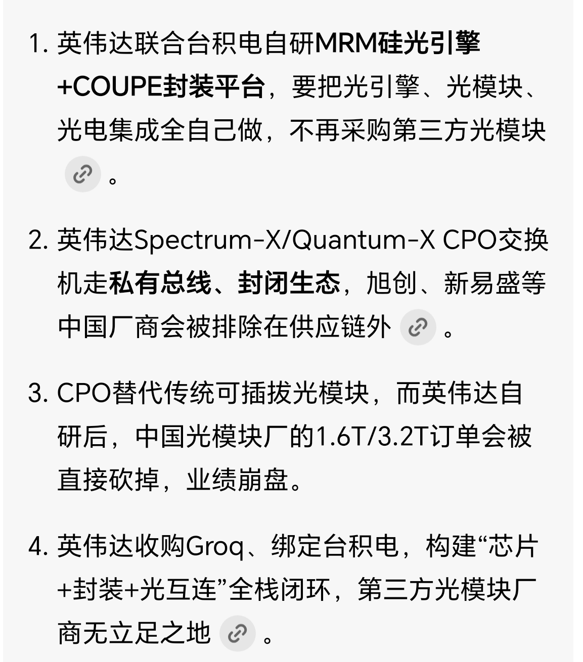 英伟达联合台积电自研MRM硅光引擎+COUPE封装平台,要把光引擎、光模块、光电集成全自己做,不再采购第三方光模块 。中际旭创、新易盛等中国厂商会被排除在供应链外 。