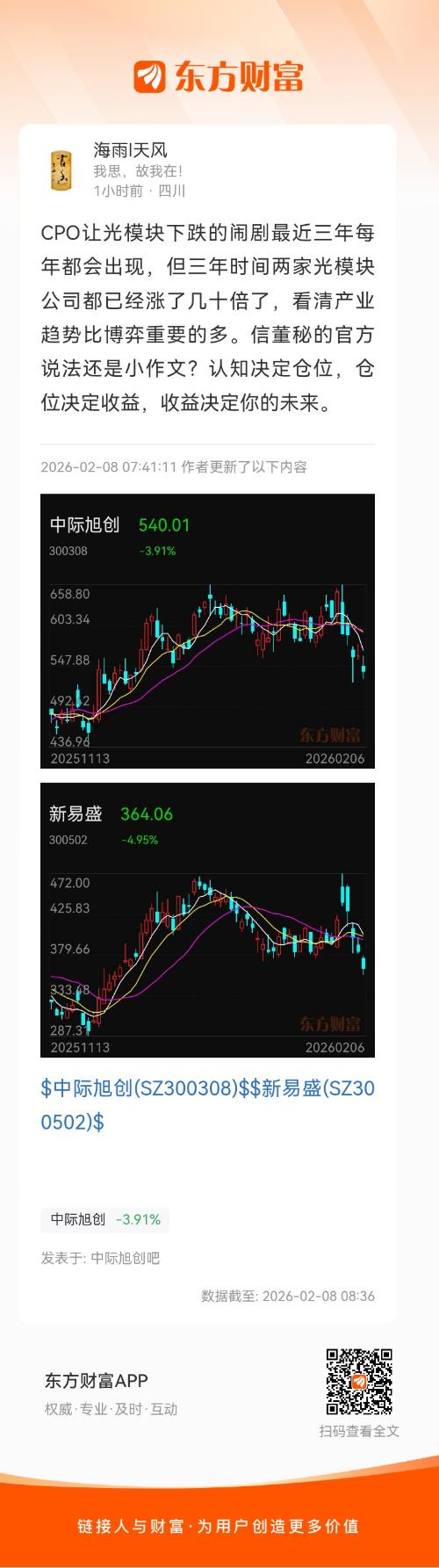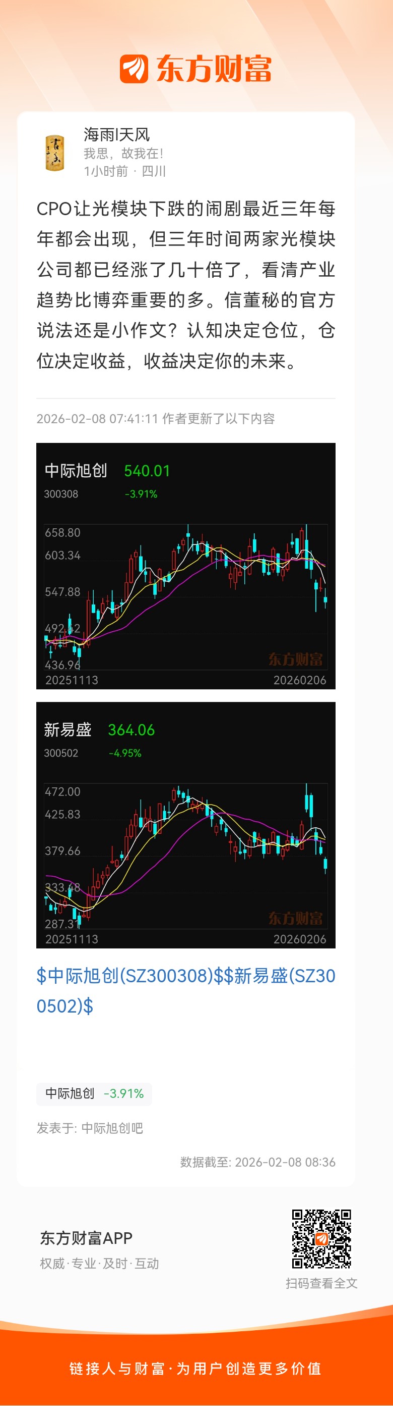 CPO让光模块下跌的闹剧最近三年每年都会出现,但三年时间两家光模块公司都已经涨了几十倍了,看清产业趋势比博弈重要的多。信董秘的官方说法还是小作文?认知决定仓位,仓位决定收益,收益决定你的未来。