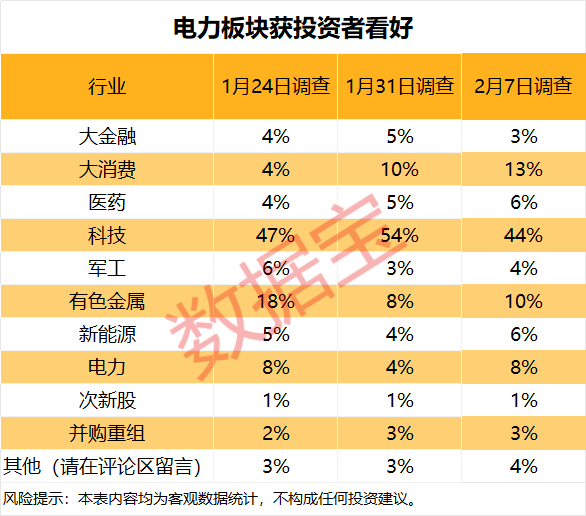 从板块来看,下周电力板块较受欢迎,8%的受访者表示看好,环比提升4个百分点;大消费板块占比13%,环比提升3个百分点。前期受访者较为看好的科技板块热度减退,占比环比下降10个百分点至44%。