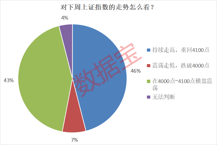 本周A股指数高位下挫,跌破4100点大关。在经历短暂震荡调整后,投资者对于接下来的市场走势普遍表示看好。调查数据显示,46%的投资者认为下周市场将“持续走高,重回4100点”,为最主流观点;43%的投资者认为下周市场将“在4000点~4100点横盘震荡”;仅有7%的投资者明确表示看空市场,表示下周市场将“震荡走低,跌破4000点”。