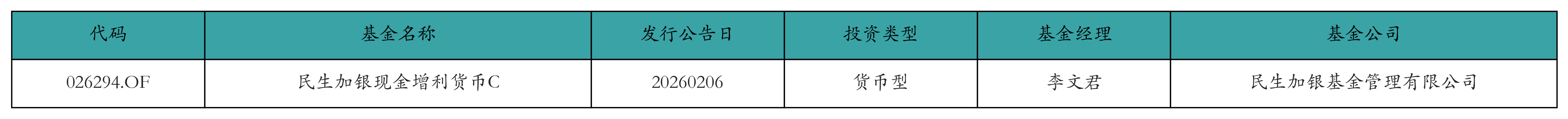 上周有1只新基金发行,分别为:民生加银现金增利货币C,详情见下表: