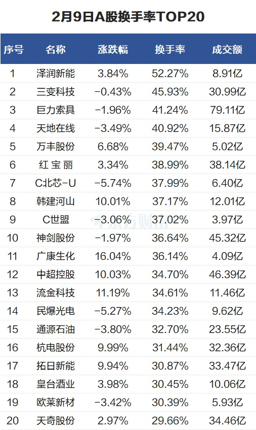 当天换手率最高的个股为泽润新能,全天换手率52.27%。三变科技紧随其后,全天换手率45.93%。
