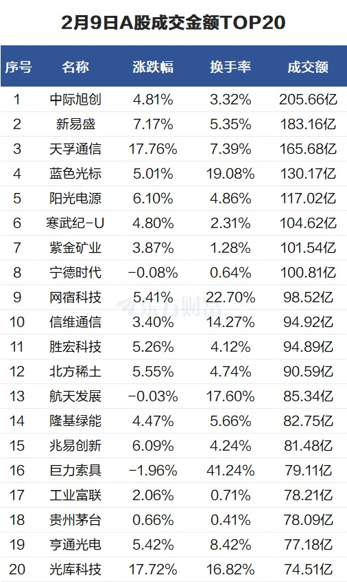 活跃个股:中际旭创成交206亿元 泽润新能换手率52%