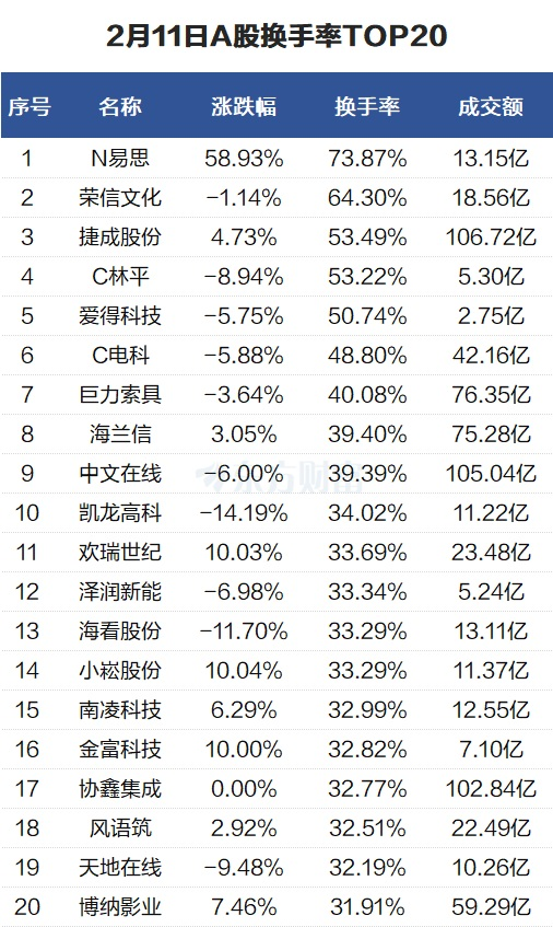 当天换手率最高的个股为N易思,全天换手率73.87%。荣信文化紧随其后,全天换手率64.3%。