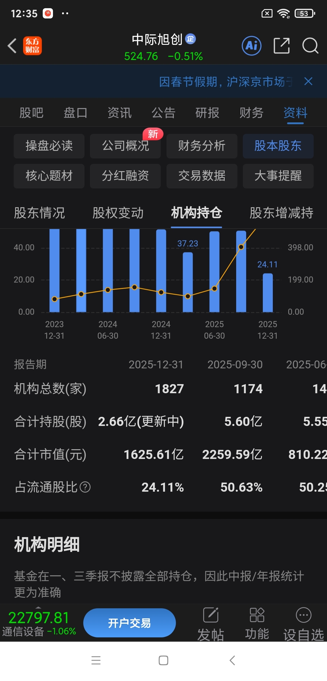 随着股价不断攀升,最早持股机构逐步退出,因此机构持股数量持续下降,但是机构家数在增加,显然,接盘侠也是“机构”,不过是“后知后觉”的机构。