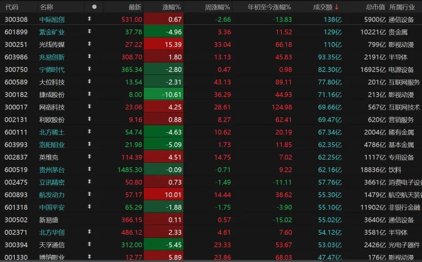 亏钱效应明显,3829只个股收跌,跌停股16只;1540只个股收涨,涨停股46只。随着交易量能缩量,日成交额超过100亿元的个股仅有3只,中际旭创收涨0.67%报531元/股,紫金矿业跌近5%,光线传媒涨幅超15%。
