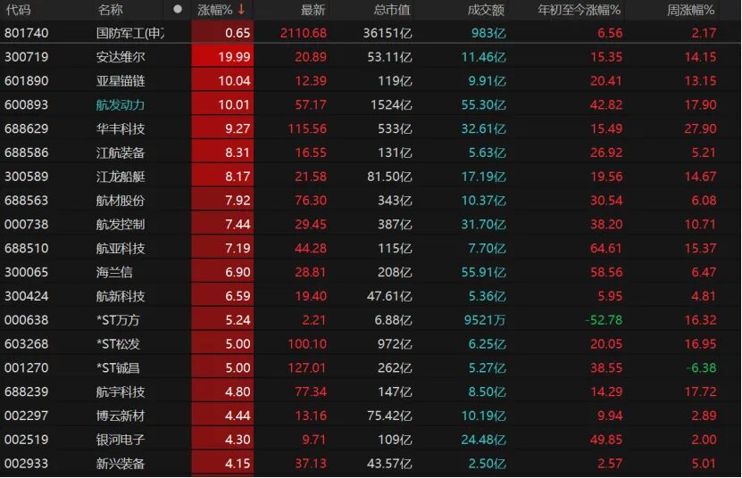 6只国防军工个股涨停,安达维尔“20cm”涨停,亚星锚链、航发动力均涨停。