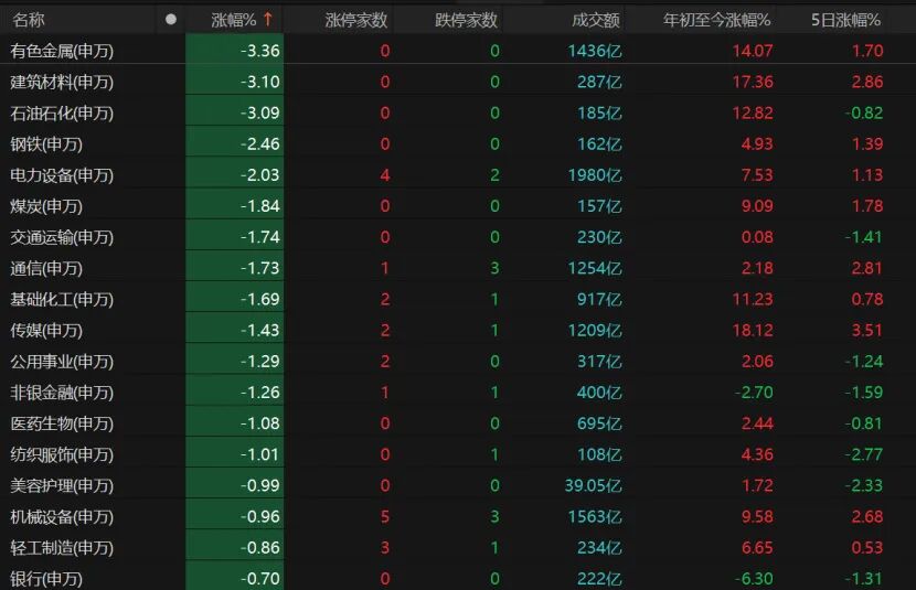 板块普跌,资源与科技板块领跌。有色金属、建筑材料、石油石化板块跌幅均超3%,钢铁、电力设备、煤炭、交通运输、通信等板块跌幅居前。