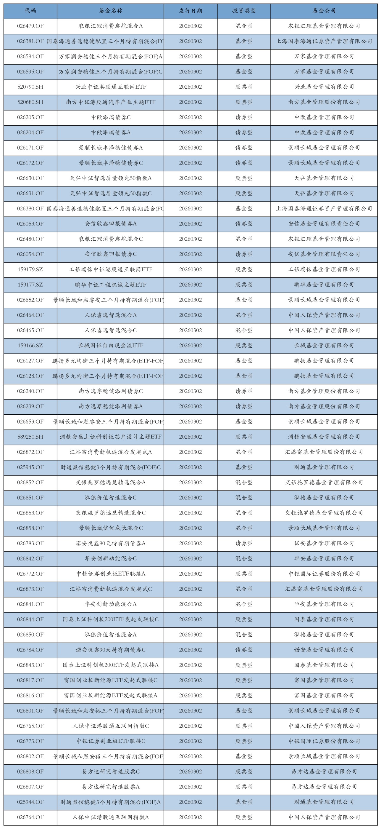 昨日有53只新基金发行,分别为:农银汇理消费启航混合A、国泰海通善选稳健配置三个月持有期混合(FOF)C、万家润安稳健三个月持有期混合(FOF)A、万家润安稳健三个月持有期混合(FOF)C、兴业中证港股通互联网ETF、南方中证港股通汽车产业主题ETF、中欧添瑞债券C、中欧添瑞债券A、景顺长城丰泽稳健债券A、景顺长城丰泽稳健债券C、天弘中证智选质量领先50指数A、天弘中证智选质量领先50指数C、国泰海通善选稳健配置三个月持有期混合(FOF)A、安信欣鑫回报债券A、农银汇理消费启航混合C、安信欣鑫回报债券C、工银瑞信中证港股通互联网ETF、鹏华中证工程机械主题ETF、景顺长城和熙睿安三个月持有期混合(FOF)A、人保睿逸智选混合A、人保睿逸智选混合C、长城国证自由现金流ETF、鹏扬多元均衡三个月持有期混合(ETF-FOF)A、鹏扬多元均衡三个月持有期混合(ETF-FOF)C、南方逸享稳健添利债券C、南方逸享稳健添利债券A、景顺长城和熙睿安三个月持有期混合(FOF)C、浦银安盛上证科创板芯片设计主题ETF、汇添富消费新机遇混合发起式A、财通聚信稳健3个月持有期混合(FOF)C、交银施罗德远见精选混合A、泓德价值智选混合C、交银施罗德远见精选混合C、景顺长城信优成长混合C、诺安悦鑫90天持有期债券A、华安创新动能混合C、中银证券创业板ETF联接A、汇添富消费新机遇混合发起式C、华安创新动能混合A、国泰上证科创板200ETF发起式联接C、泓德价值智选混合A、诺安悦鑫90天持有期债券C、国泰上证科创板200ETF发起式联接A、富国创业板新能源ETF发起式联接C、富国创业板新能源ETF发起式联接A、景顺长城和熙安裕三个月持有期混合(FOF)A、人保中证港股通互联网指数C、中银证券创业板ETF联接C、景顺长城和熙安裕三个月持有期混合(FOF)C、易方达研究智选股票C、易方达研究智选股票A、财通聚信稳健3个月持有期混合(FOF)A、人保中证港股通互联网指数A,详情见下表: