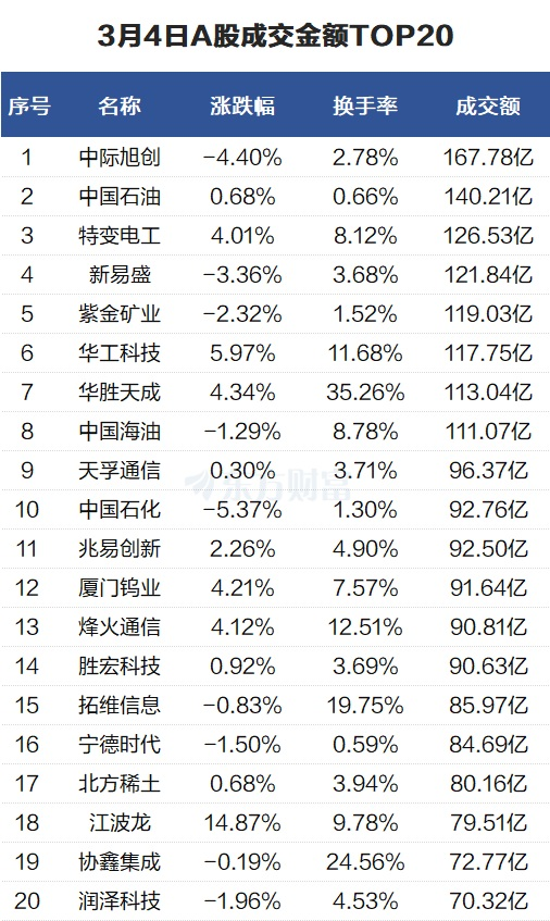 沪深两市成交额2.37万亿元,较上一交易日缩量7638亿元。个股方面,中际旭创当日成交167.78亿元。中国石油当日成交140.21亿元。