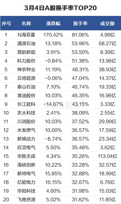 当天换手率最高的个股为N海菲曼,全天换手率81.06%。通源石油紧随其后,全天换手率53.96%。