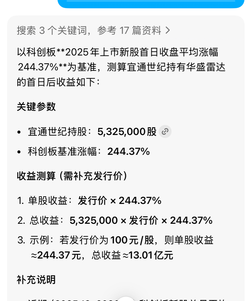 在华盛雷达上市首日,宜通世纪平均收益达到13亿,按照投资公允价值估值来计算,合理