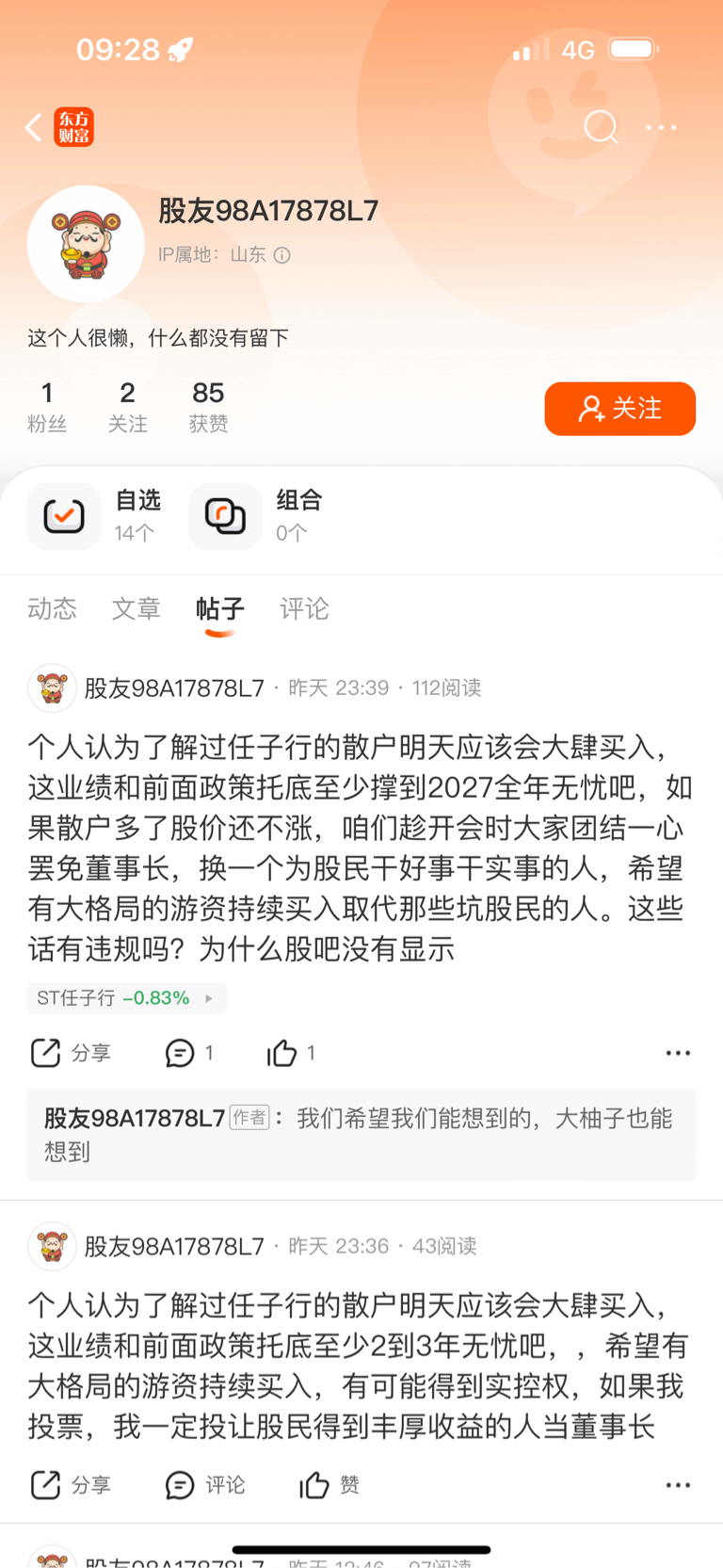 $ST任子行(SZ300311)$ 这厮@股友98A17878L7 之前不是叫嚷着破4么?怎么现在又开始幻想全年无忧了?还散户团结换董事长?你这种硇子是怎么长到这么大的?