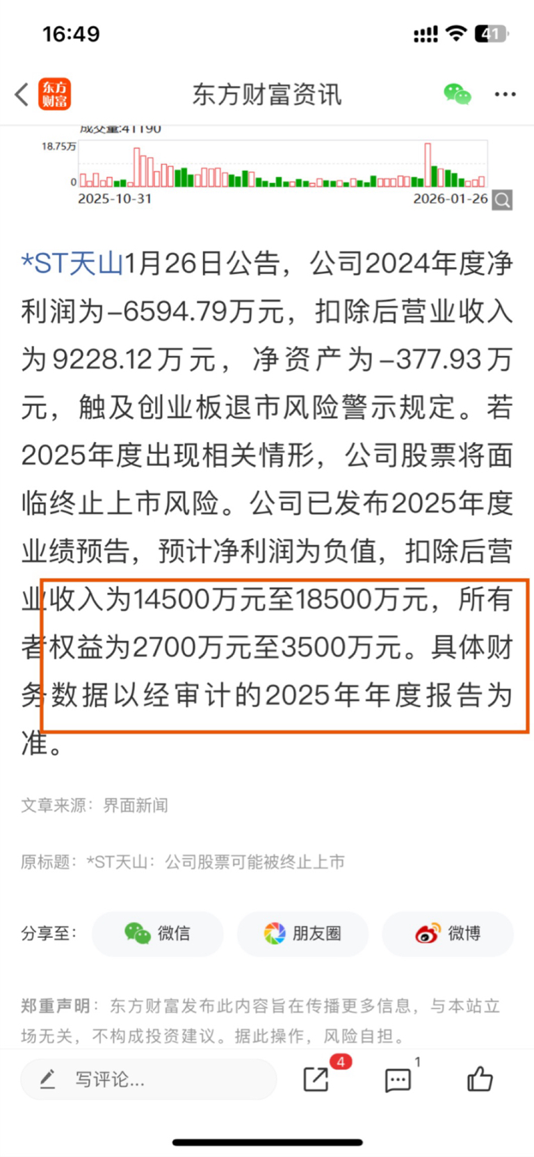 $*ST天山(SZ300313)$ 公司保壳成功落地,去除退市风险,摘帽就差审计报告出具标准无保留意见了,有韭友说净利润为负影响摘帽,这个不是绝对的,主要是审计机构通过判断营收质量以及减亏幅度来出具是否可持续经营的判断,太多类似ST股都成功摘帽,不一一列举,大家可以豆包去查询一下即可,营收增长和扣非净利润同比增长都相对有质量,净资产也为正,年报后摘星是肯定的,摘帽需要审计出具无保留的标准意见
