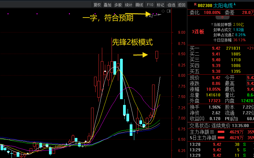 $太阳电缆(SZ002300)$:没啥可说的,今天躺一字。昨日先锋快板今日一字是符合预期的,因为强上强走法只能如此。不过呢,这种类型的票,一定在盘前做好两手准备,因为一旦低于预期,往往是快速下滑,周二牧风同样做的先锋榕基软件的秒板,但周三只开了8%,不是一字或小T,一定秒撤退,因为它在2分钟内跌到绿盘。这就是情绪票的特质,脑速不够没问题,提前准备,临盘手速要跟上。
