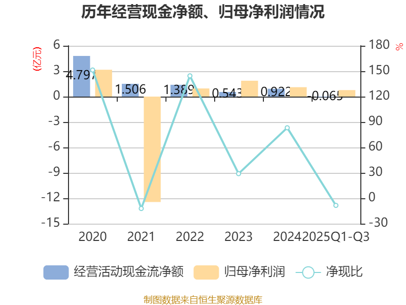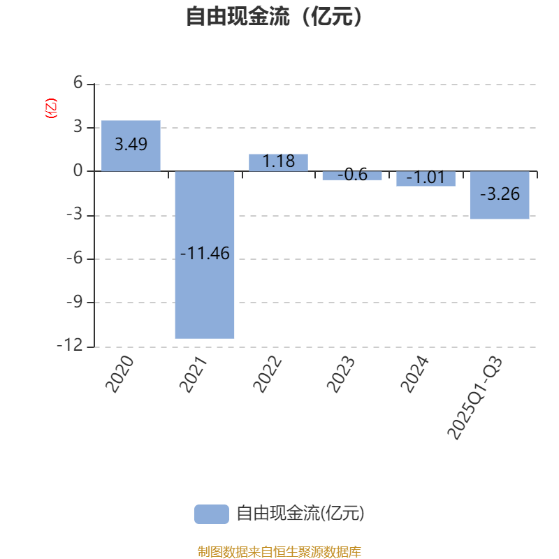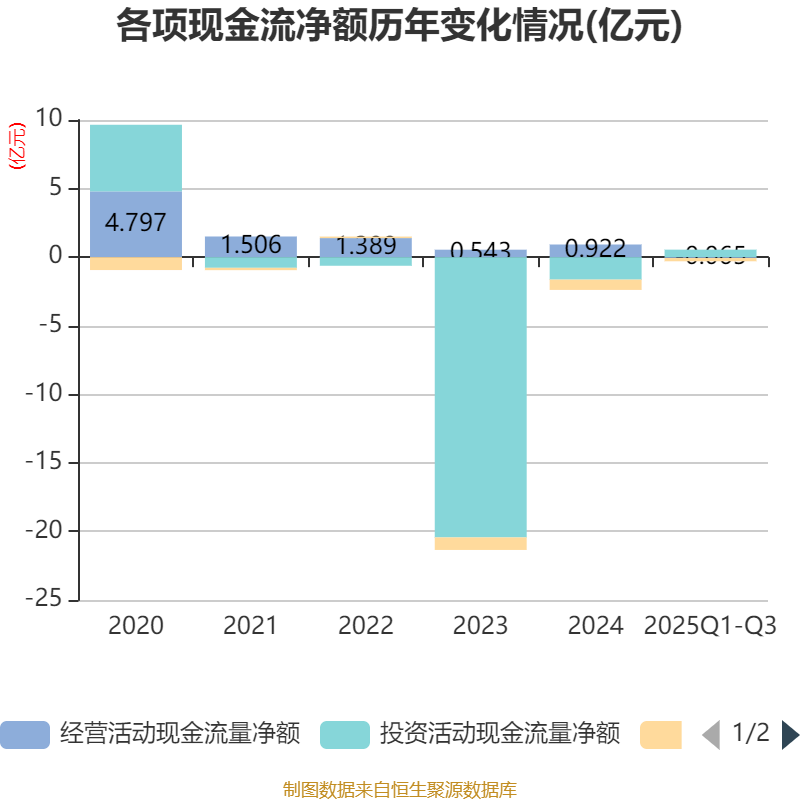 2025年前三季度,公司经营活动现金流净额为-645.53万元,同比减少8327.86万元;筹资活动现金流净额-2361.96万元,同比增加3028.23万元;投资活动现金流净额5457.86万元,上年同期为-1.6亿元。