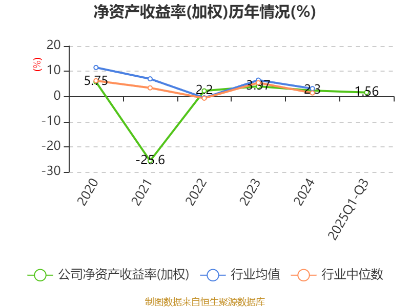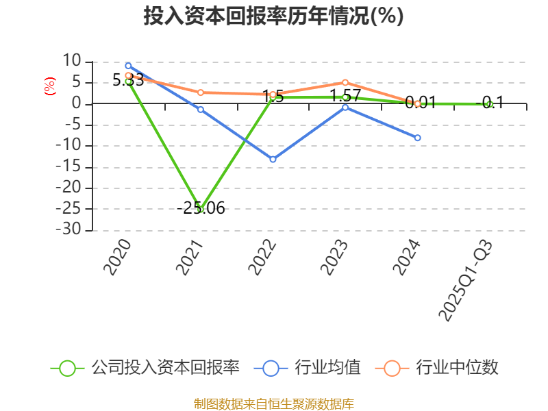 盈利能力方面, 2025年前三季度公司加权平均净资产收益率为1.56%,同比下降2.49个百分点。公司2025年前三季度投入资本回报率为-0.1%,较上年同期下降2.34个百分点。