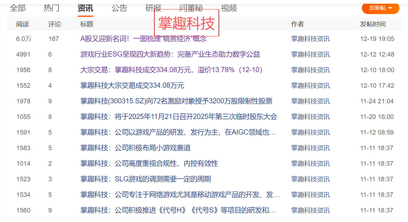 掌趣资讯很少很少,但是含金量强。就一条犒赏概念资讯就破6万浏览量。看看妖股翻8倍的世纪华通每天发好多好多资讯,一个月上百条世纪华通资讯,想想看世纪华通董秘拿多少万工资。掌趣科技一个月就几条资讯。游戏板块其它公司每天资讯不断。