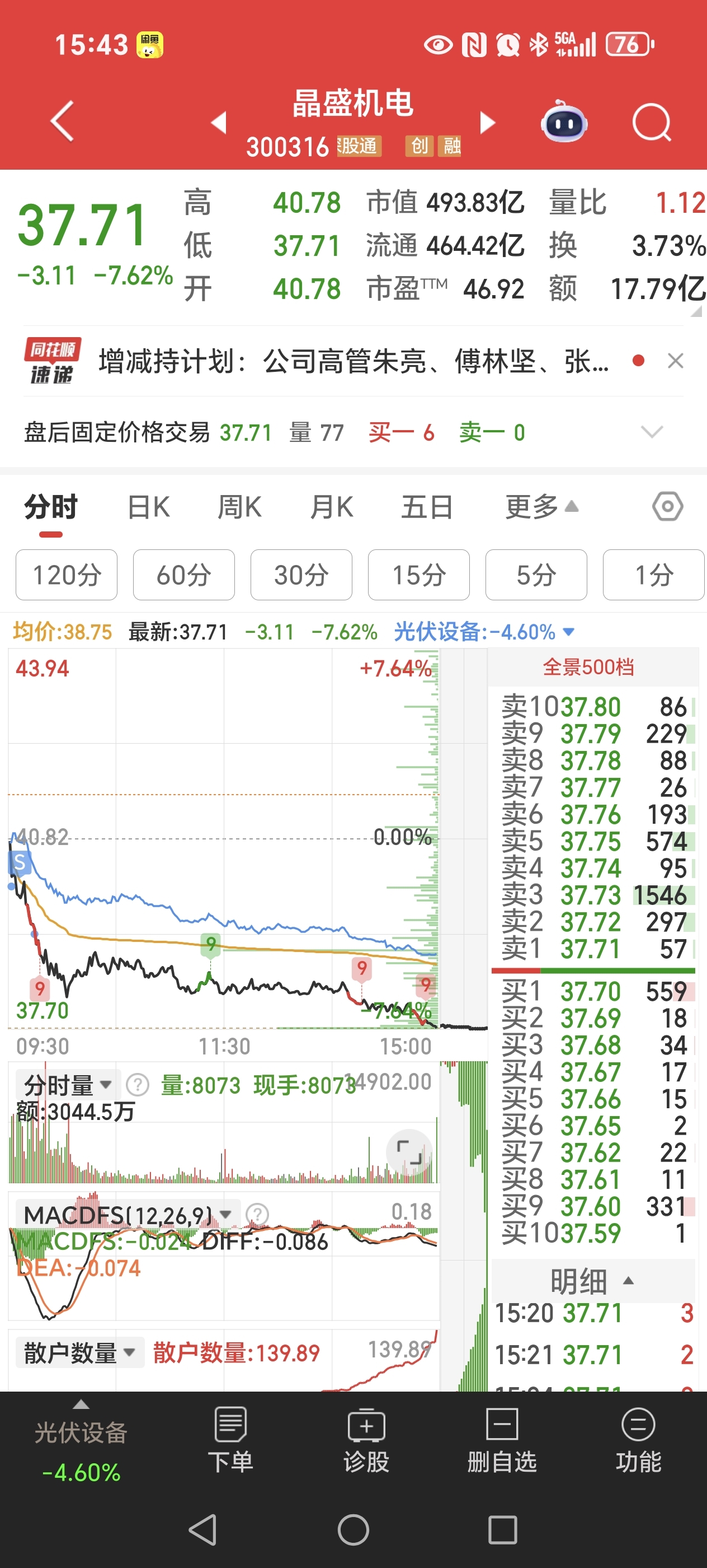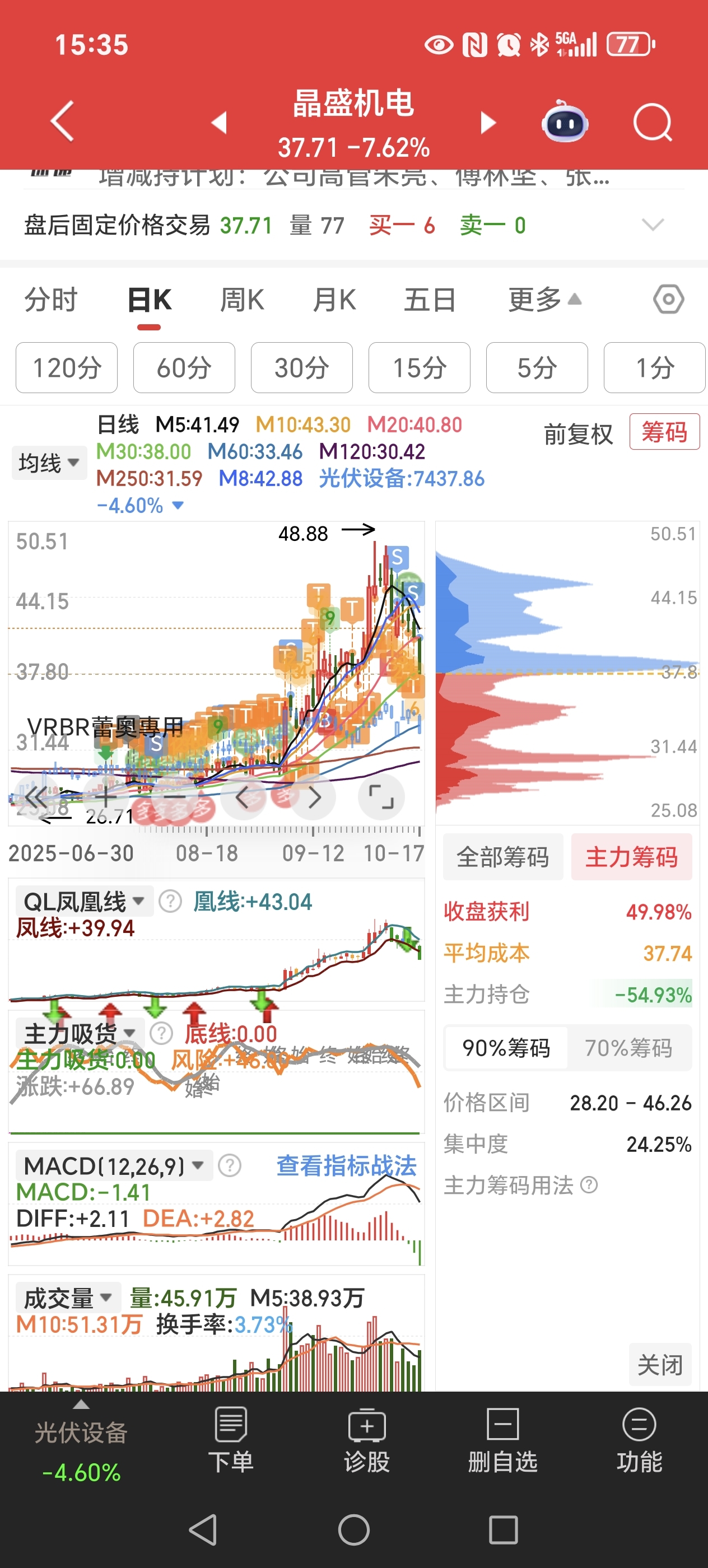 $晶盛机电(SZ300316)$ 持有3个月,26时候开始建仓关注,理性唱多,48.88出来那天就知道是短期顶了,昨天出了减持公告,今天全部清仓,减持公告一出,第二天就要走,不管怎么分析,很多时候都说是挖坑,对,那也不是一天两天吸完就上涨的。等企稳再进岂不是更好,为何在里面心里折磨。日线刚形成死叉,绿柱超长,短期需要寻底,建议不要随便去补仓