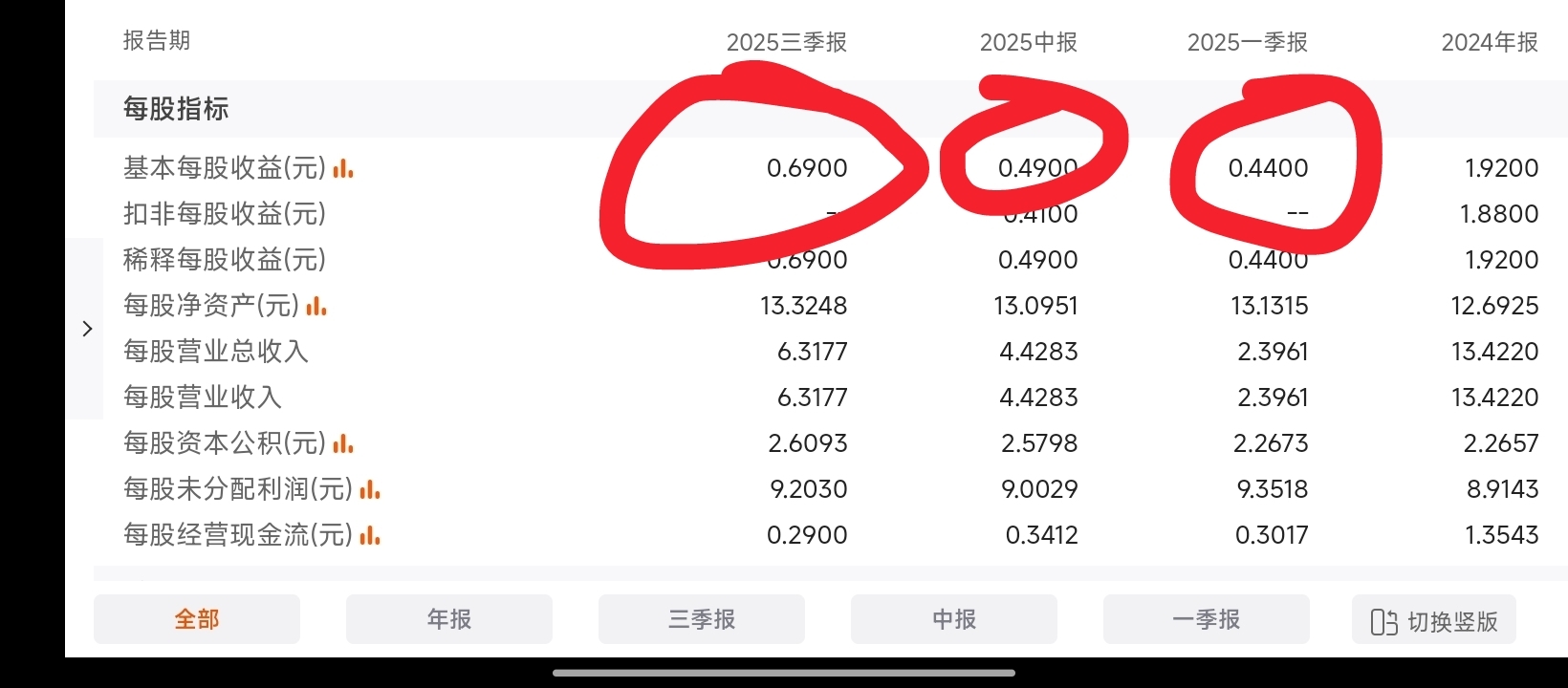 我看了这个图,其实第三季度明显好转了呀。第一季度每股收益0.44元,第二季度每股