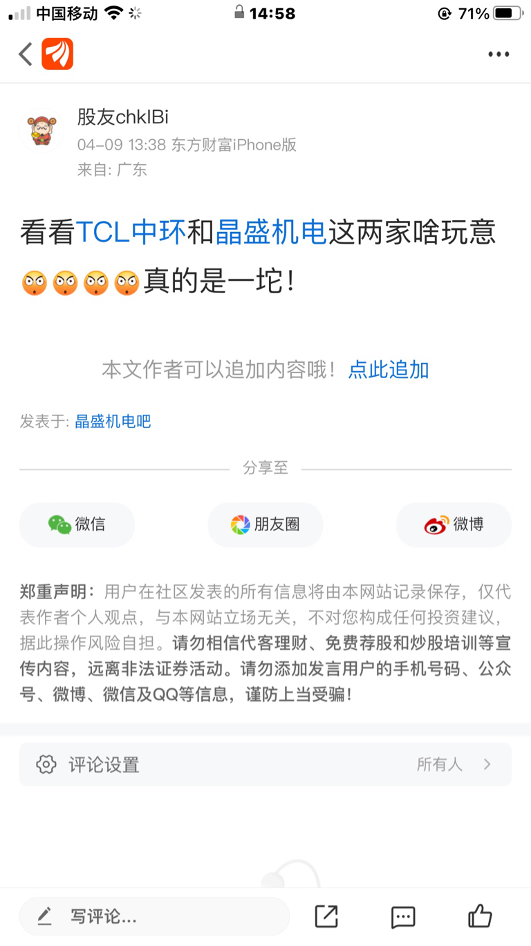 温馨提示: 1.根据《证券法》规定,禁止编造、传播虚假信息或者误导性信息,扰乱证券市场;2.用户在本社区发表的所有资料、言论等仅代表个人观点,与本网站立场无关,不对您构成任何投资建议。用户应基于自己的独立判断,自行决定证券投资并承担相应风险。《东方财富社区管理规定》