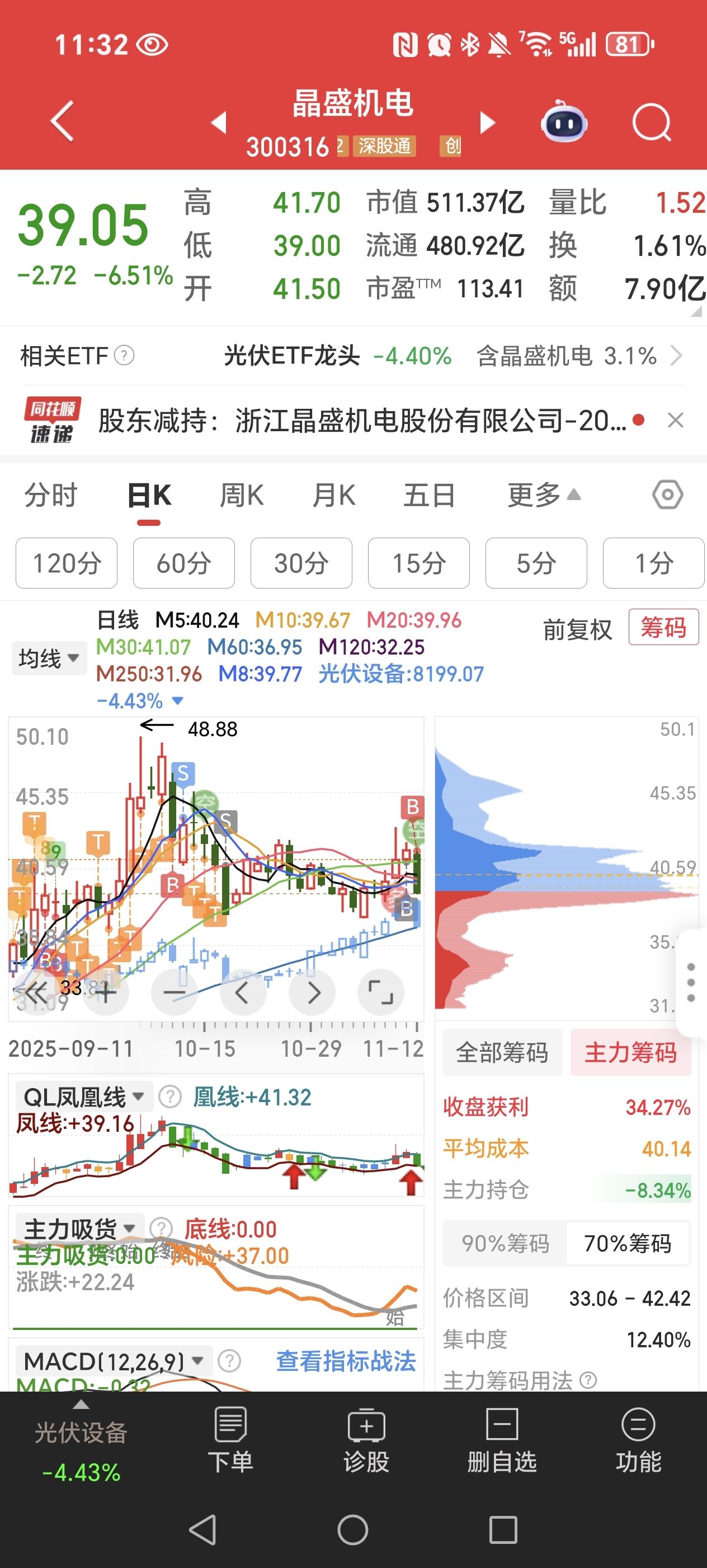 $晶盛机电(SZ300316)$ 没太看懂,日线刚要金叉今天就砸穿了,上午40还补了点,下午可能要减点先出来了