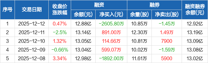 晶盛机电:融资净偿还2605.8万元,融资余额12.88亿元(12-12)