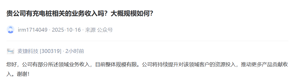 麦捷科技:充电桩业务领域有部分收入 整体规模有限