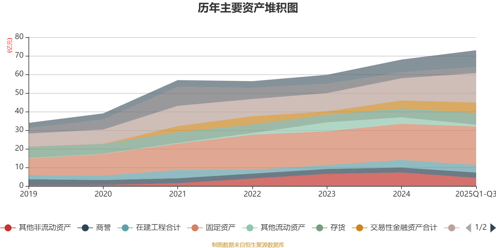 资产重大变化方面,截至2025年三季度末,公司其他非流动资产较上年末减少39.9%,占公司总资产比重下降4.69个百分点;应收票据及应收账款较上年末增加32.63%,占公司总资产比重上升4.12个百分点;其他流动资产较上年末减少73.15%,占公司总资产比重下降3.86个百分点;存货较上年末增加34.02%,占公司总资产比重上升1.73个百分点。