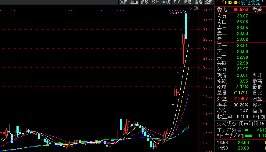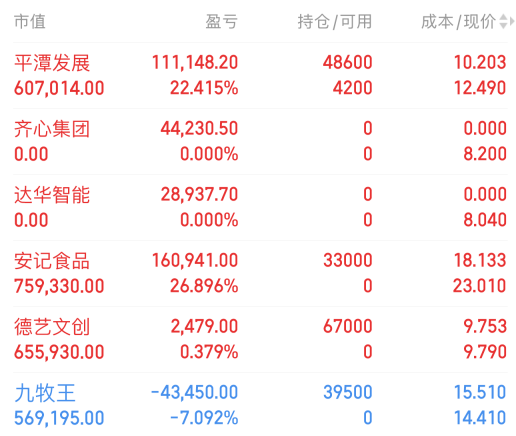 安记食品:这个票北哥砸板,拿下26点大禸,尾盘又拿回了。这么做有两个考量,首先,它是海峡题材里的第七轮补涨龙,前面的补涨龙高度都是5--7板,所以它也很难突破天花板。其次,昨天大消费是热度最高的,安记因为涨高了断板是可以理解的,但从板位回落到绿盘,有点过了。毕竟就目前而言,它还是大消费的全场高度。基于这两点,北哥决定再博一下今天的反包。