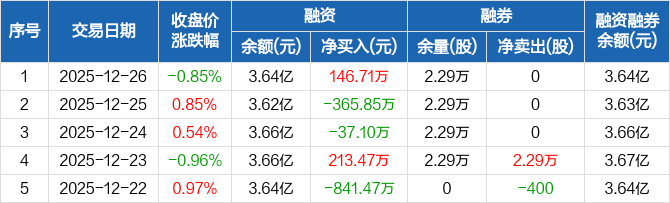 海达股份:融资净买入146.71万元,融资余额3.64亿元(12-26)