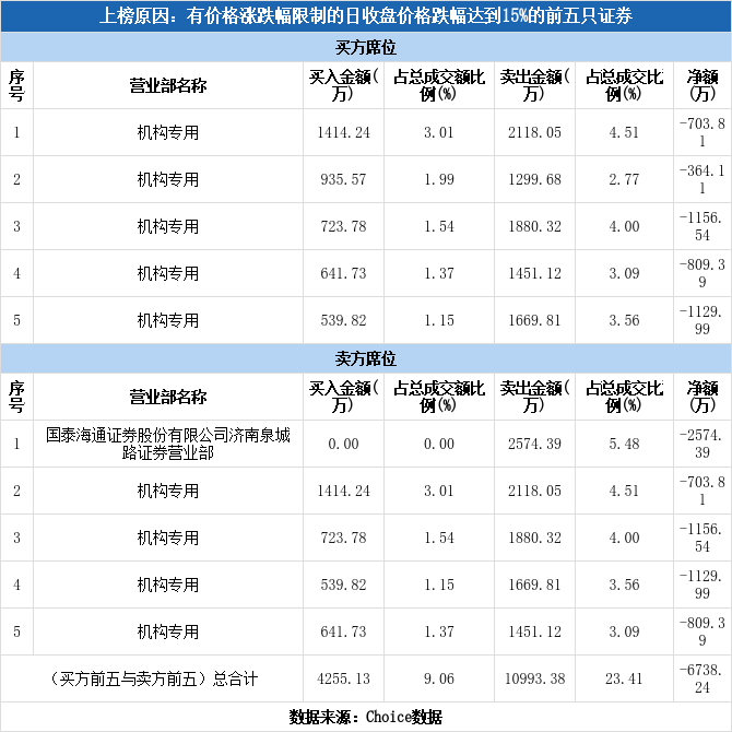 龙虎榜数据显示,今日共9个机构席位出现在龙虎榜单上,分别位列买一、买二、买三、买四、买五、卖二、卖三、卖四、卖五,合计净卖出4163.85万元,占龙虎榜净卖额的61.79%。除此之外还有神农种业、多氟多、海南海药等47只个股榜单上出现了机构的身影,其中24家呈现机构净买入,获净买入最多的是神农种业,净买额为4.85亿元;23家呈现机构净卖出,其中遭净卖出最高的为美埃科技,净卖额为1.37亿元。