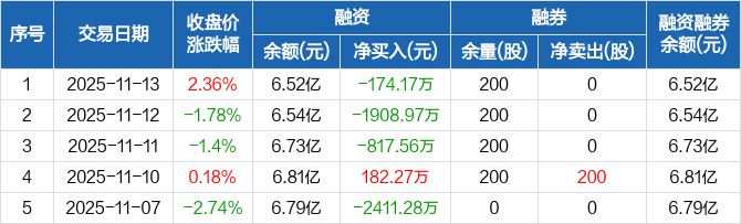 融资方面,当日融资买入2566.31万元,融资偿还2740.48万元,融资净偿还174.17万元,连续3日净偿还累计2900.7万元。融券方面,融券卖出0股,融券偿还0股,融券余量200股,融券余额1130元。融资融券余额合计6.52亿元。