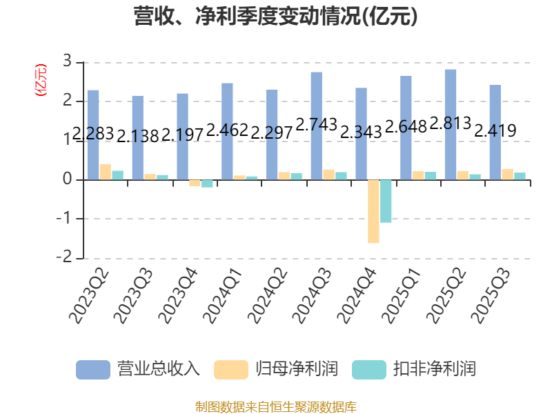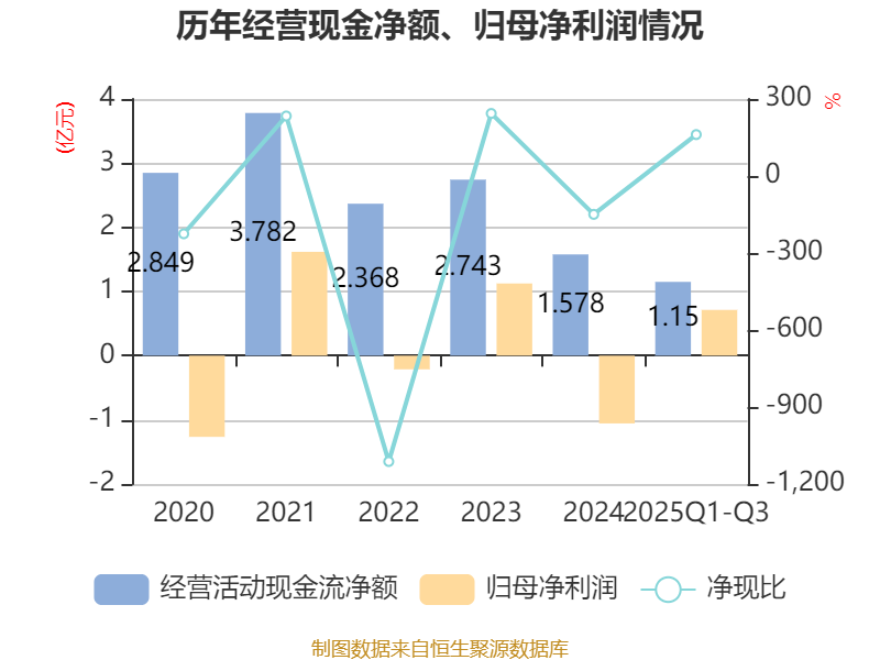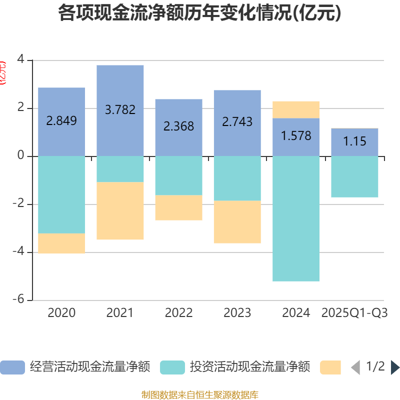 2025年前三季度,公司经营活动现金流净额为1.15亿元,同比增长26.64%;筹资活动现金流净额135.61万元,同比减少2285.1万元;投资活动现金流净额-1.72亿元,上年同期为-5.05亿元。
