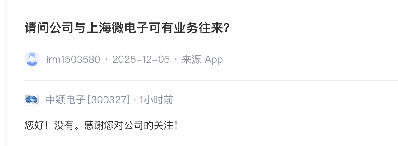 12月10日,21财经《辟谣财知道》注意到,针对市场传闻称,中颖电子(300327.SZ)与上海微电子存在业务往来一事。中颖电子在投资者互动平台作出明确回应称,“没有”。