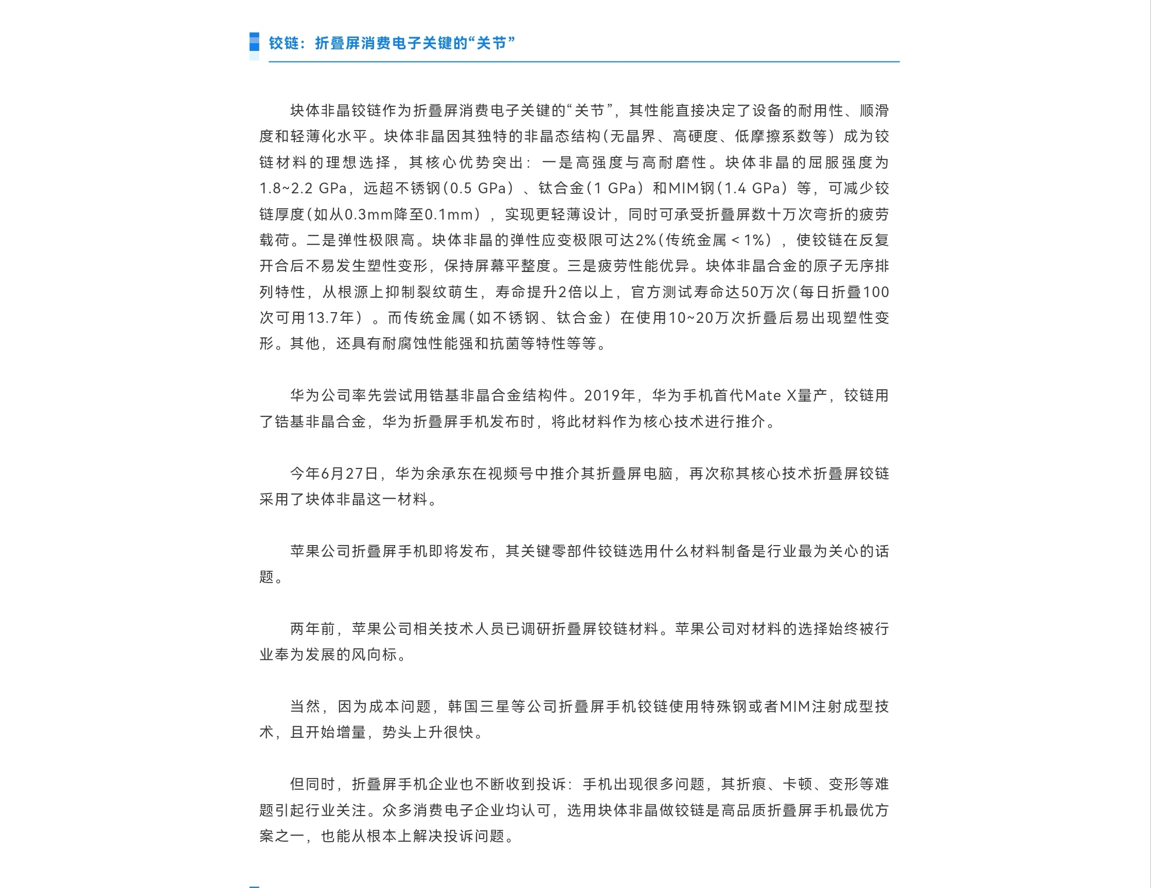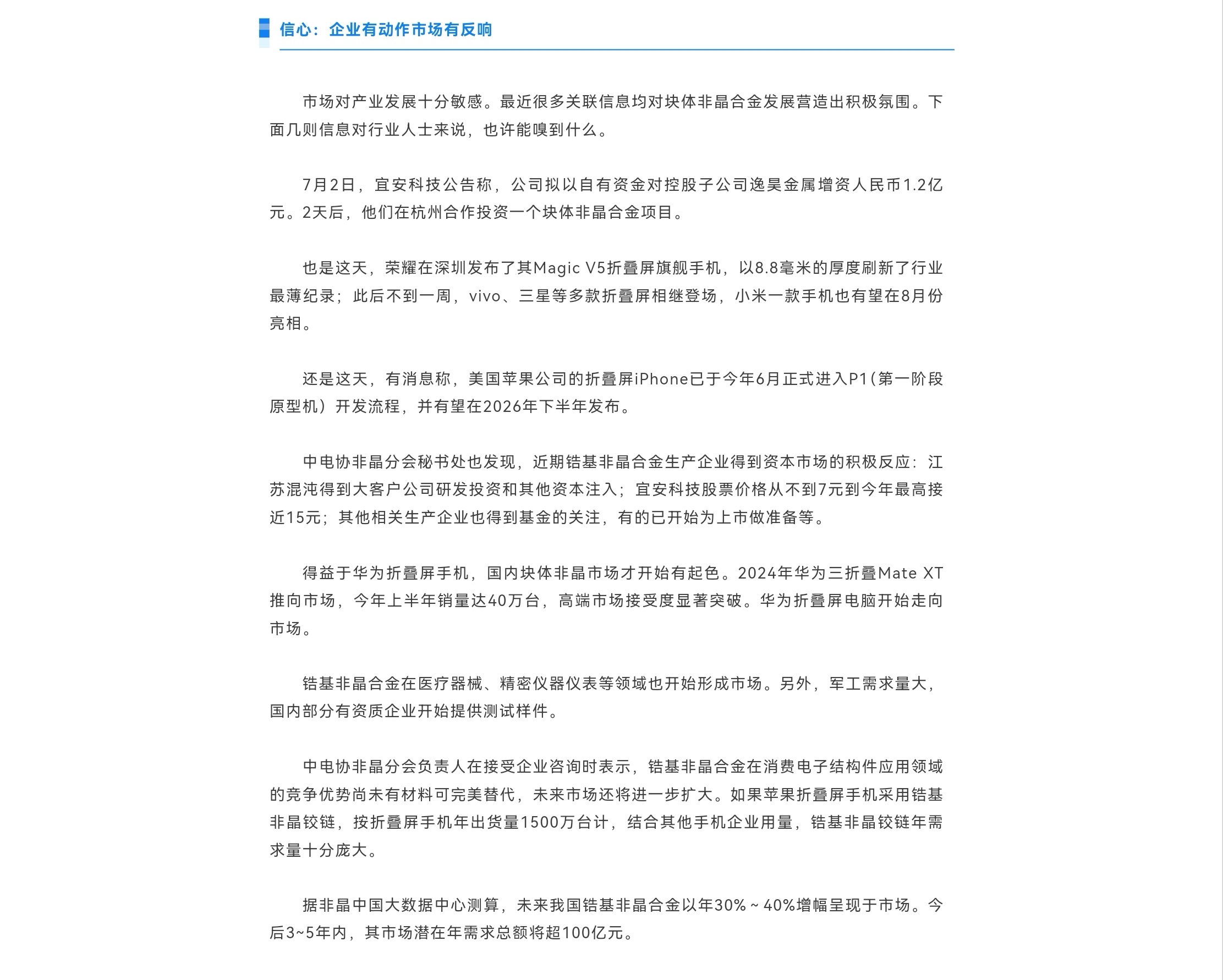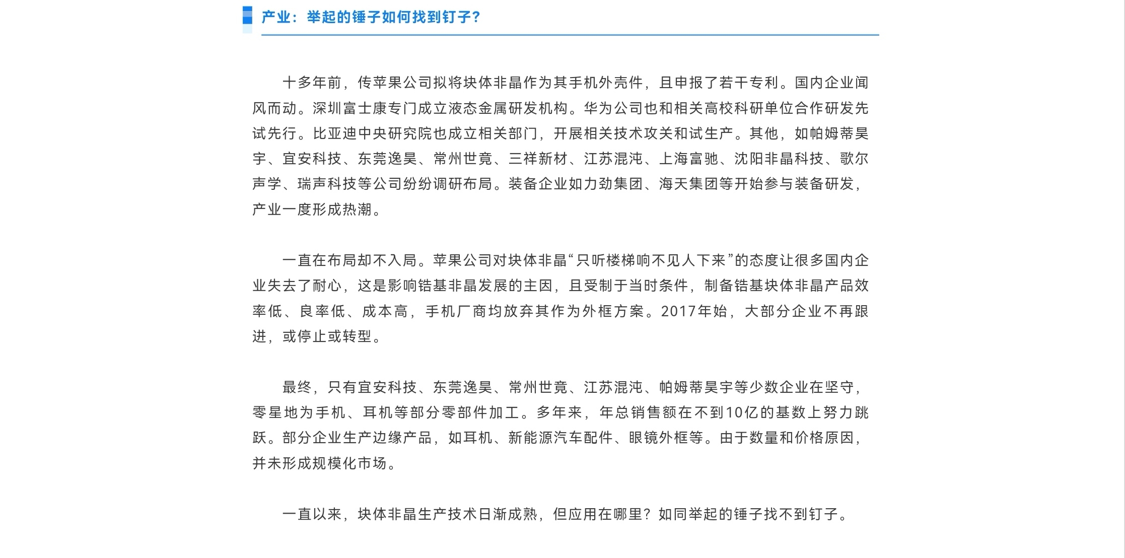 近年来,非晶合金新材料产业发展较快。非晶合金软磁功能材料在电力电子产业中展示出节能减碳特点,在新能源产业中有广泛应用,表现出巨大市场潜力。非晶合金另一形态——块体非晶,一般作为结构件材料,以形成能力较好的锆基合金为主,其在消费电子、精密仪表、军工等领域有广阔应用前景。虽发展多年,但块体非晶合金产业尚未形成规模。