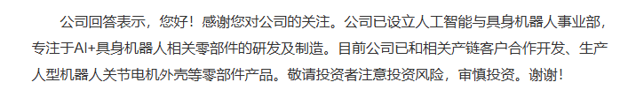 公司已设立人工智能与具身机器人事业部,专注于AI+具身机器人相关零部件的研发及制造