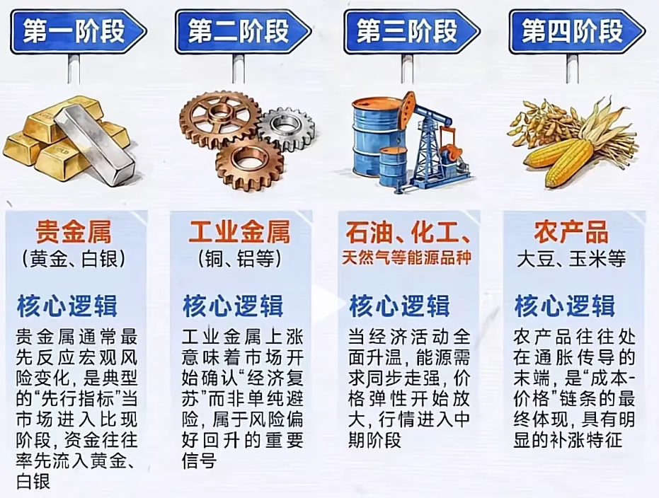 涨价四部曲,记住这个口诀:金银先行(避险情绪,货币超发)铜铝紧跟(经济复苏,基建