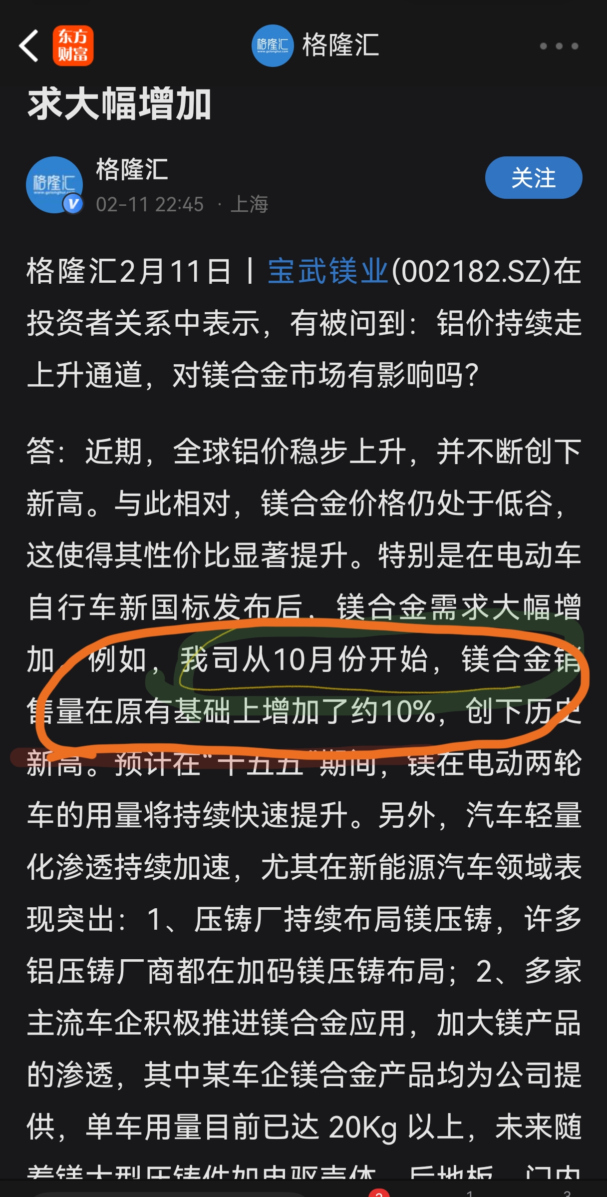 $宜安科技(SZ300328)$ 宝武镁业的镁合金销量明显增加。宜安科技的镁合金一直满负荷生产,增加的是不是更多…